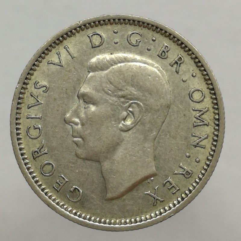 Strieborná obehová minca nominálnej hodnoty 6 pence z roku 1945. Minca nesie na rube portrét kráľa Georga VI.