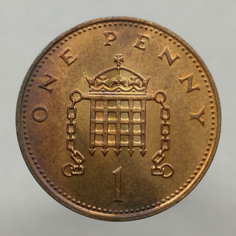 Obehová minca nominálnej hodnoty 1 penny z roku 1984.