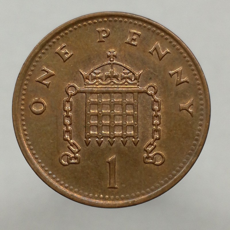 Obehová minca nominálnej hodnoty 1 penny z roku 2000. Minca nesie na rube portrét kráľovnej Elizabeth II.