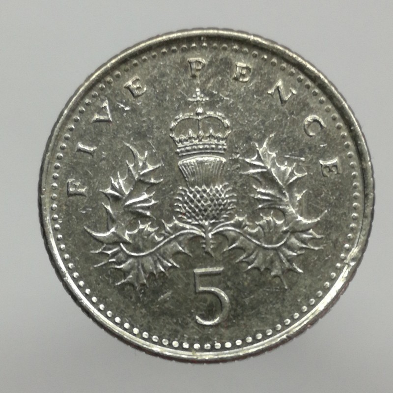 Obehová minca nominálnej hodnoty 5 pence z roku 2003. Minca nesie na rube portrét kráľovnej Elizabeth II.