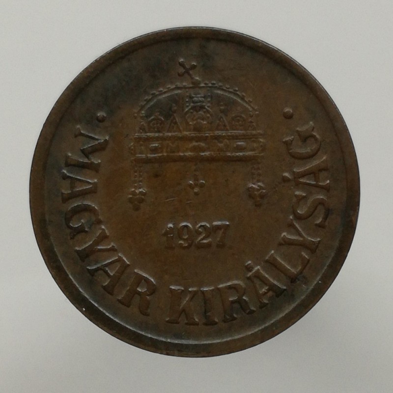 Obehová minca nominálnej hodnoty 2 fillér z roku 1927. Minca platila na území Maďarska.