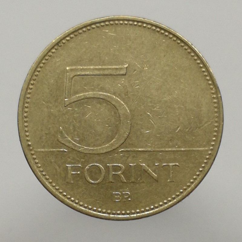Obehová minca nominálnej hodnoty 5 forint z roku 2001. Minca platila na území Maďarska.