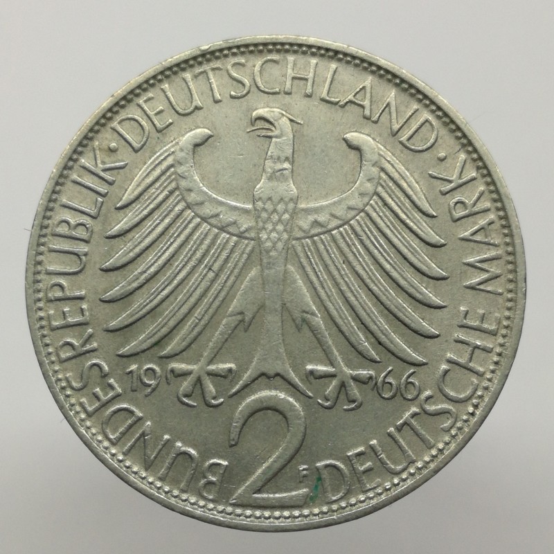 Obehová minca nominálnej hodnoty 2 mark z roku 1966. Minca platila v Nemecku.