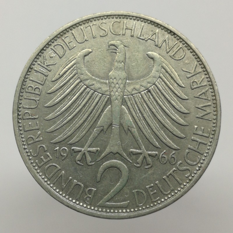 Obehová minca nominálnej hodnoty 2 mark z roku 1966. Minca platila v Nemecku.