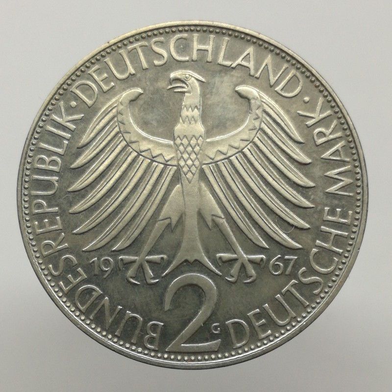 Obehová minca nominálnej hodnoty 2 mark z roku 1967. Minca platila v Nemecku.
