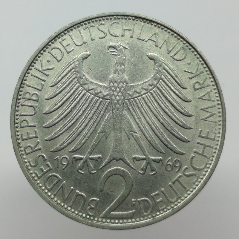 Obehová minca nominálnej hodnoty 2 mark z roku 1969. Minca platila v Nemecku.