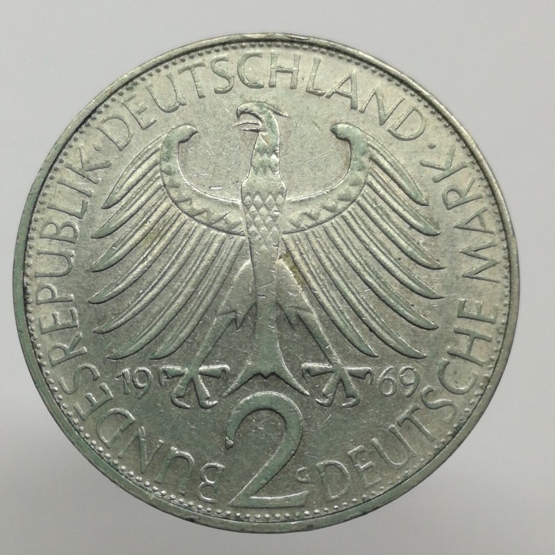 Obehová minca nominálnej hodnoty 2 mark z roku 1969. Minca platila v Nemecku.