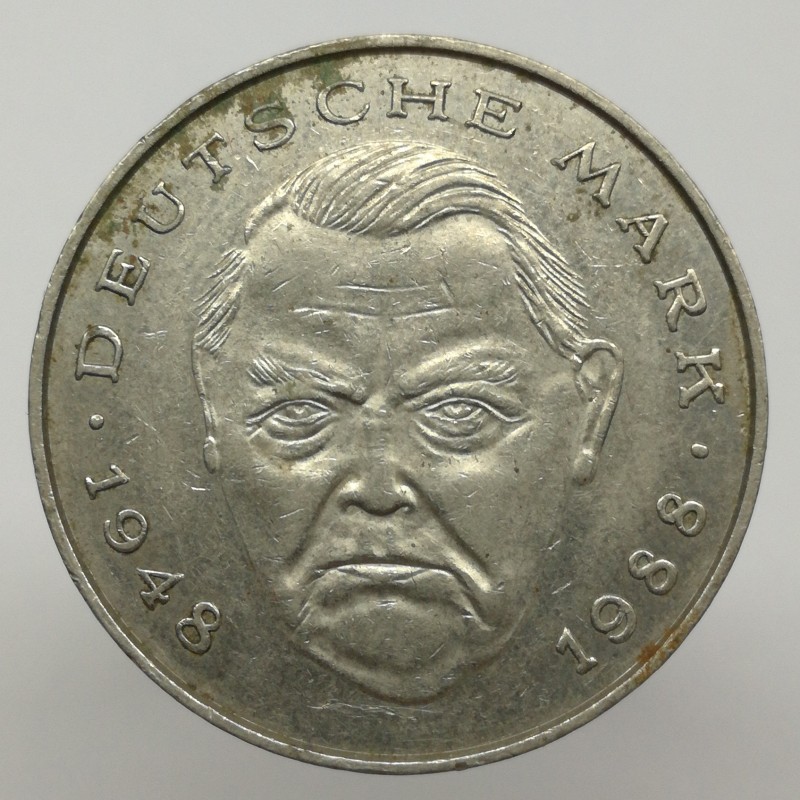 Obehová minca nominálnej hodnoty 2 mark z roku 1988. Minca platila v Nemecku.