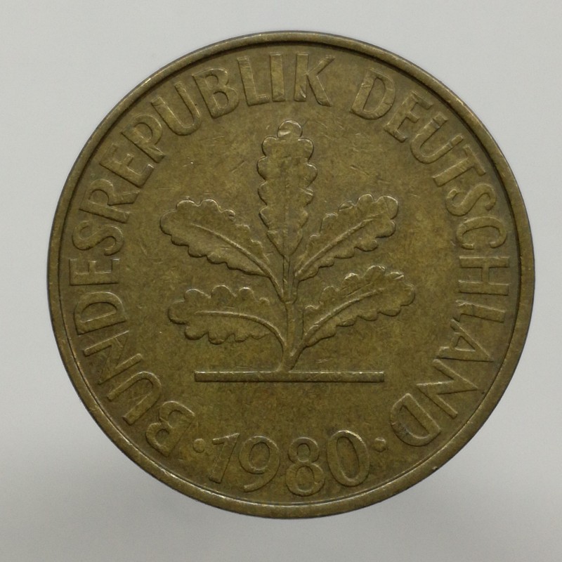 Obehová minca nominálnej hodnoty 10 pfennig z roku 1980. Minca platila v Nemecku.