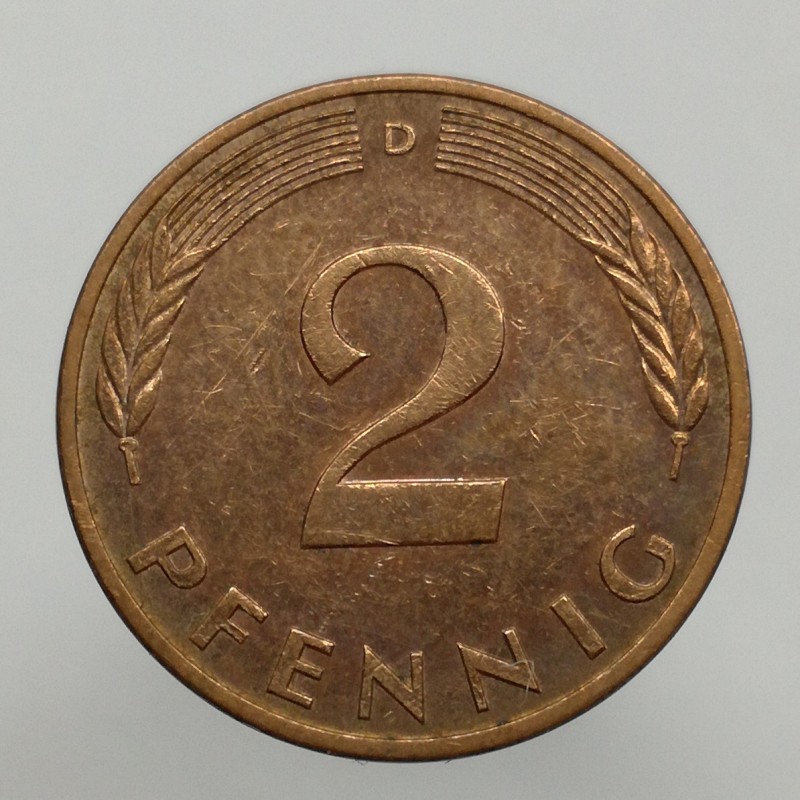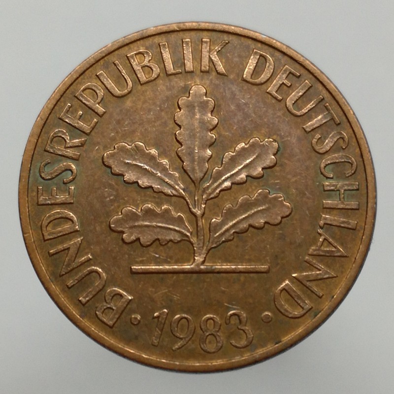 Obehová minca nominálnej hodnoty 2 pfennig z roku 1983. Minca platila v obehu v Nemecku.