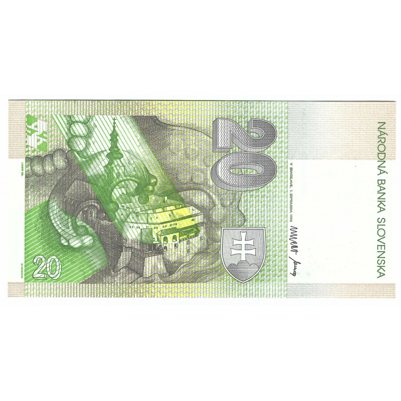 Bankovka nominálnej hodnoty 20 Slovenských korún série A z roku 1993. Je neperforovaná v zberateľskej kvalite XF. Bola tlačená v Kanade a jej autormi sú J. Bubák a R. Beckers.