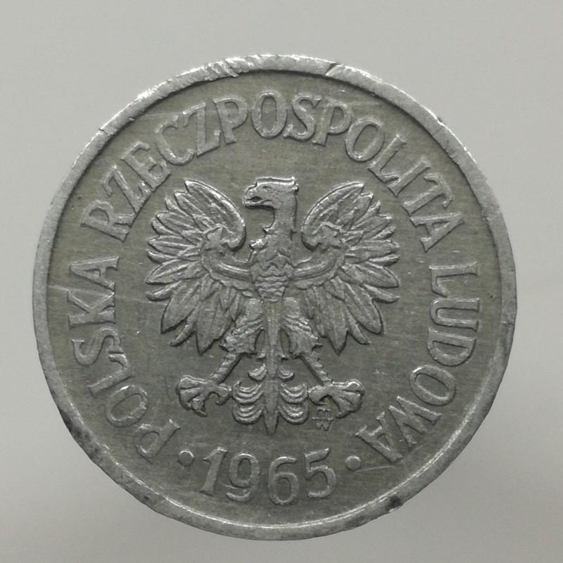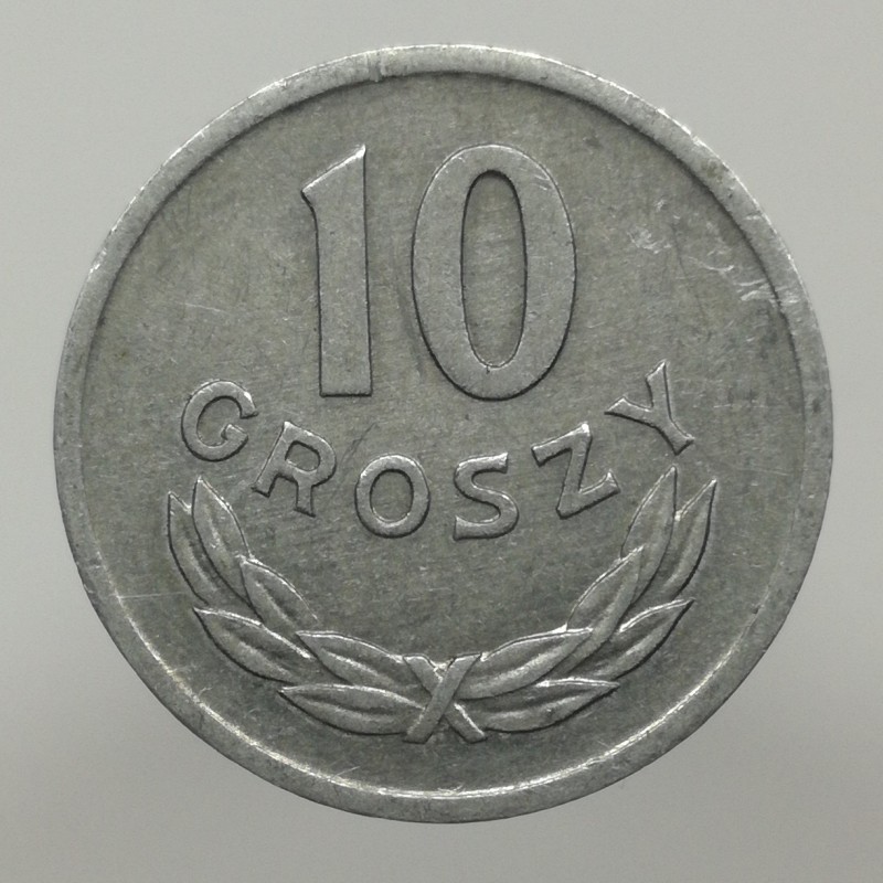 Obehová minca nominálnej hodnoty 10 groszy z roku 1965. Minca platila na území Poľska.