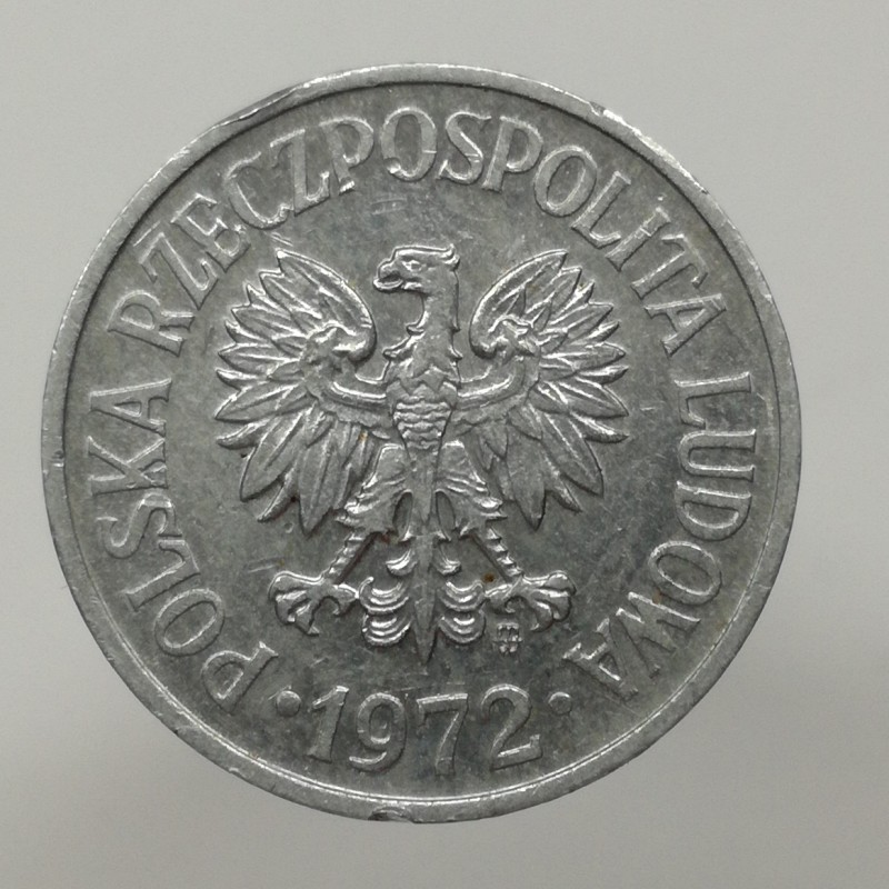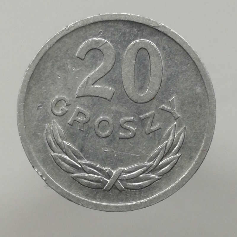 Obehová minca nominálnej hodnoty 20 groszy z roku 1972. Minca platila na území Poľska.