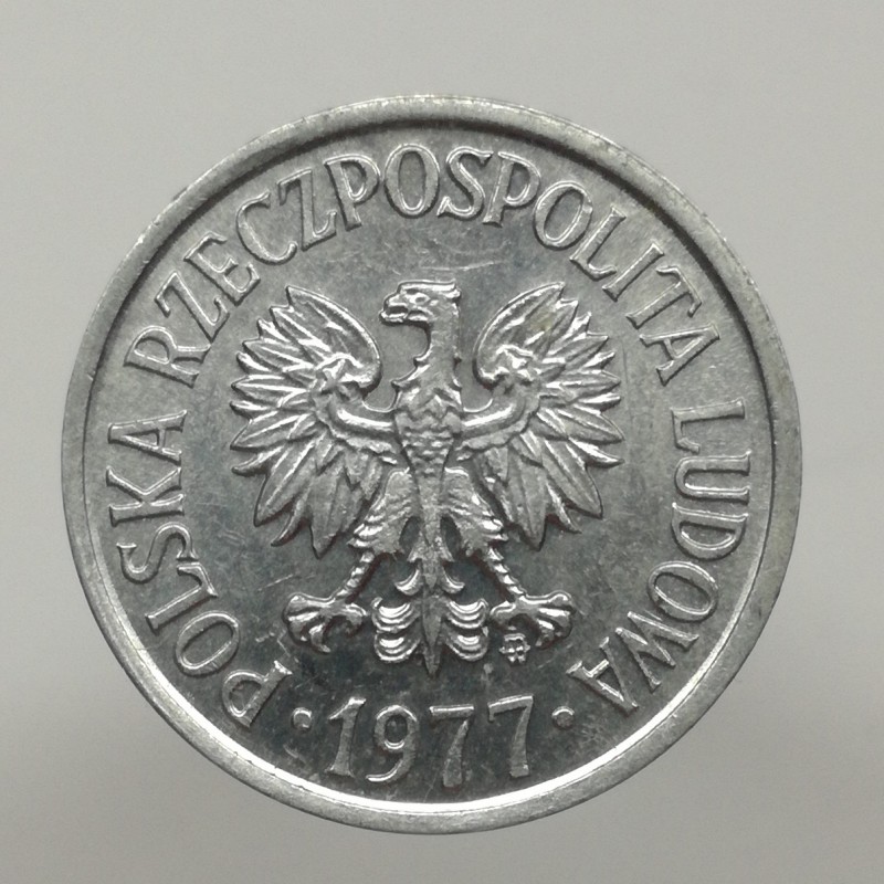 Obehová minca nominálnej hodnoty 20 groszy z roku 1977. Minca platila na území Poľska.