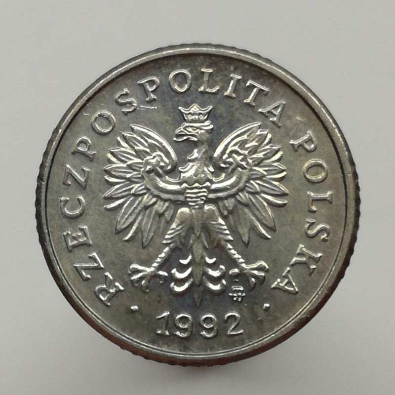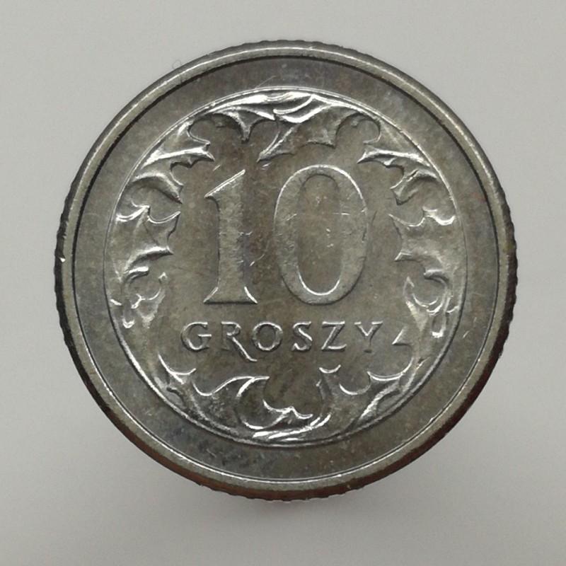 Obehová minca nominálnej hodnoty 10 groszy z roku 1992. Minca platila na území Poľska.
