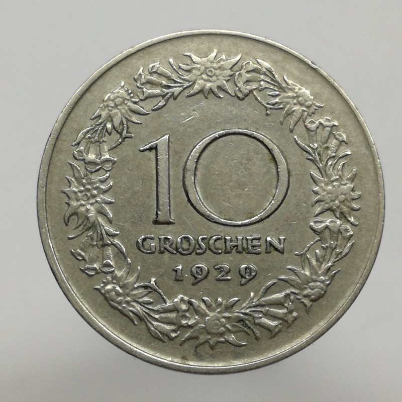 Obehová minca nominálnej hodnoty 10 groschen z roku 1929. Minca platila v obehu v Rakúsku.