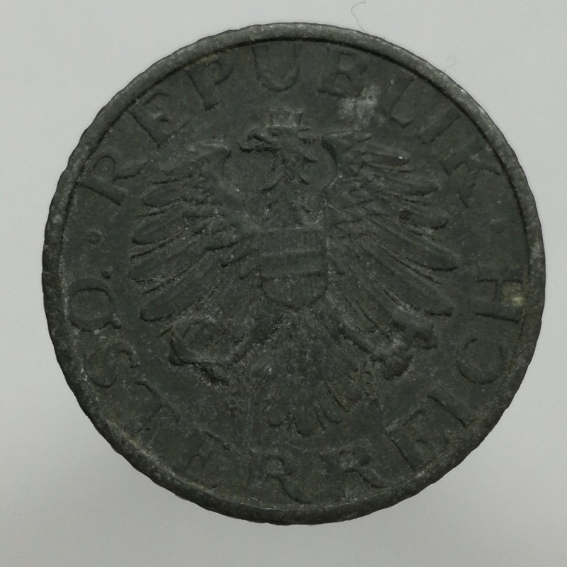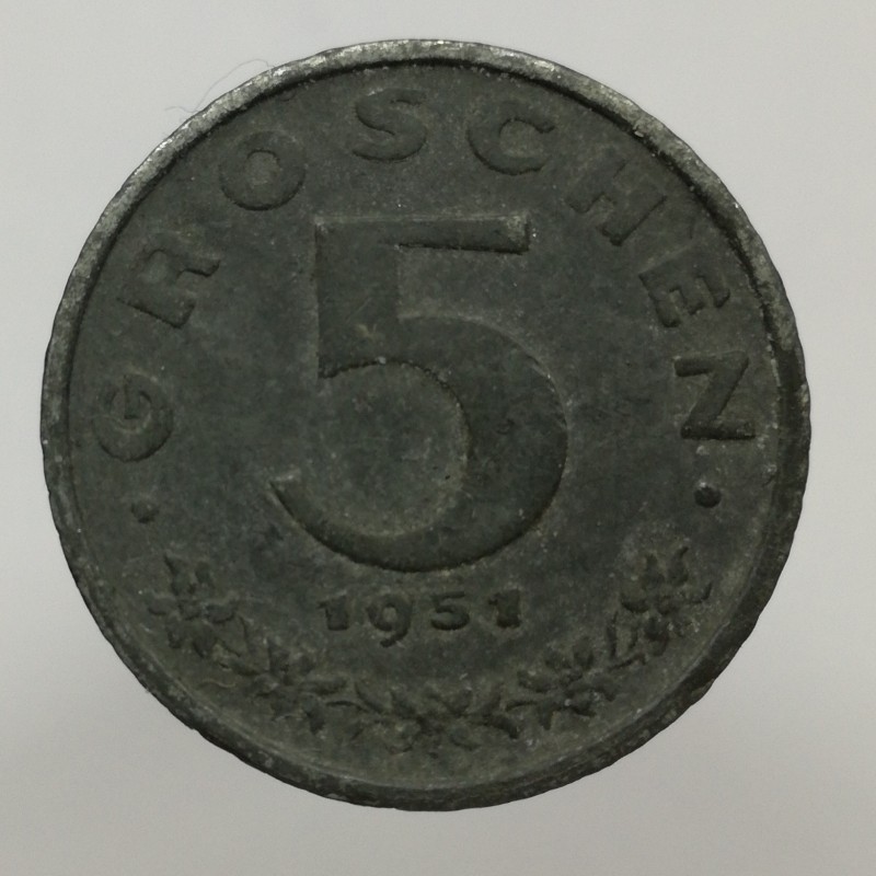 Obehová minca nominálnej hodnoty 5 groschen z roku 1951. Minca platila v obehu v Rakúsku.