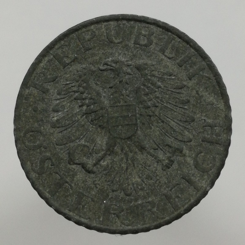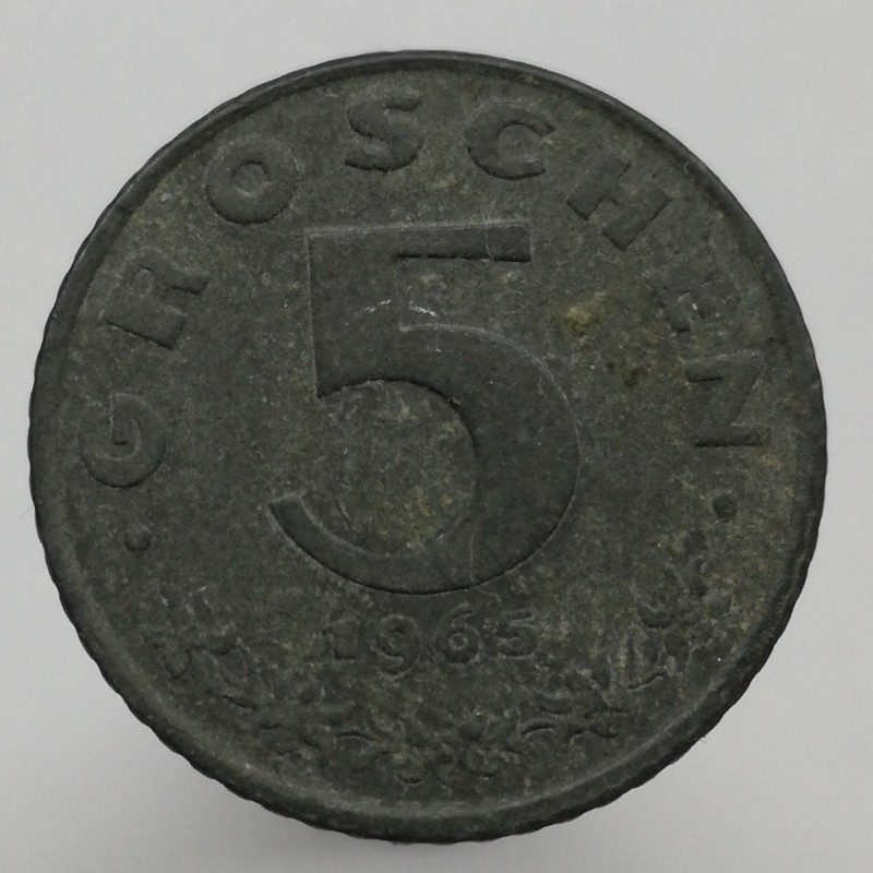 Obehová minca nominálnej hodnoty 5 groschen z roku 1965. Minca platila v obehu v Rakúsku.