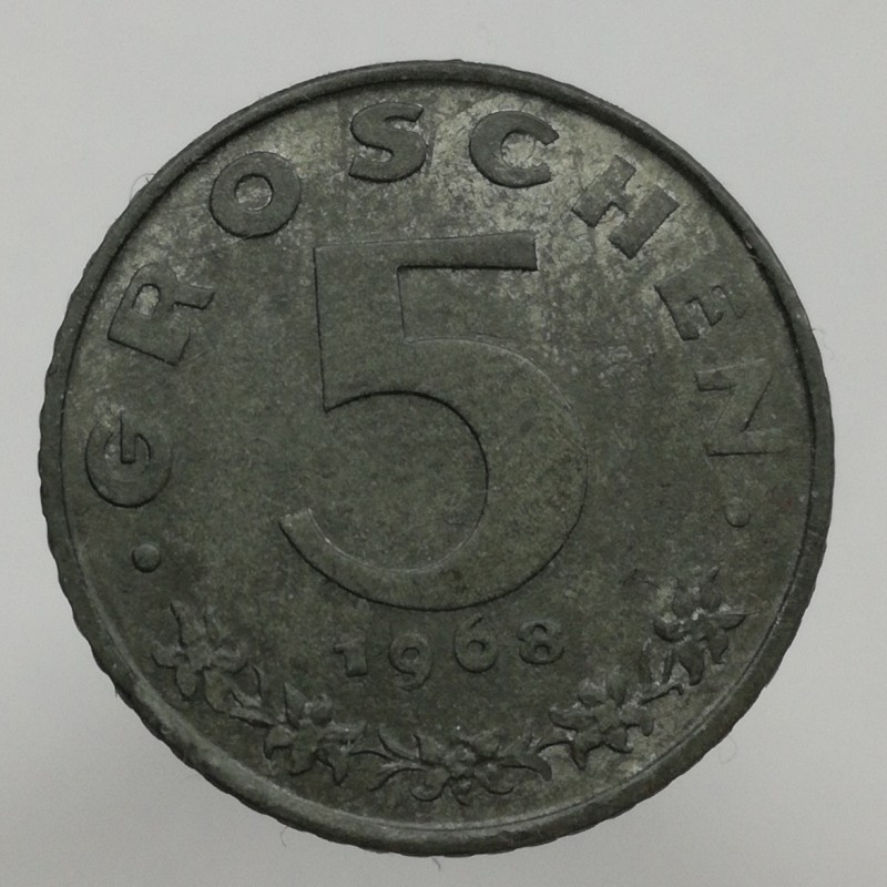 Obehová minca nominálnej hodnoty 5 groschen z roku 1968. Minca platila v obehu v Rakúsku.