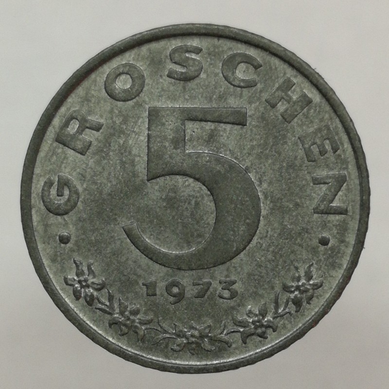 Obehová minca nominálnej hodnoty 5 groschen z roku 1973. Minca platila v obehu v Rakúsku.