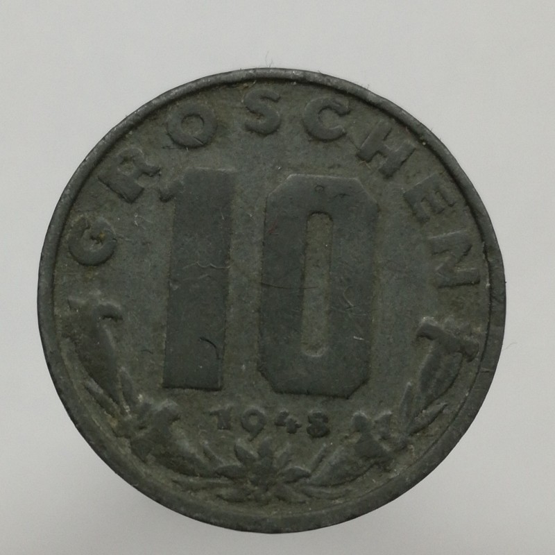 Obehová minca nominálnej hodnoty 10 groschen z roku 1948. Minca platila v obehu v Rakúsku.