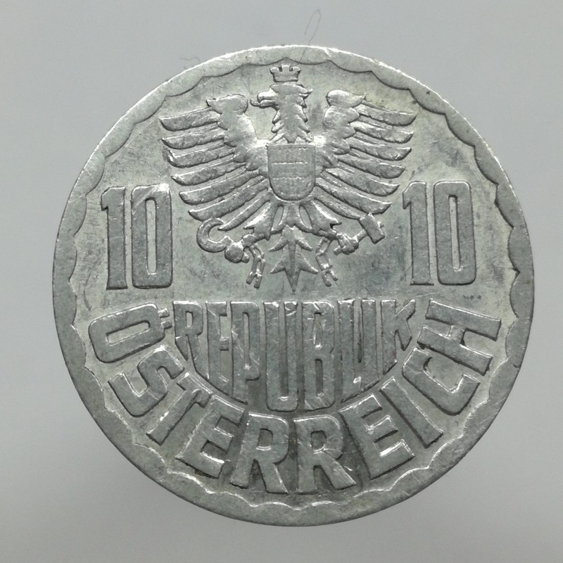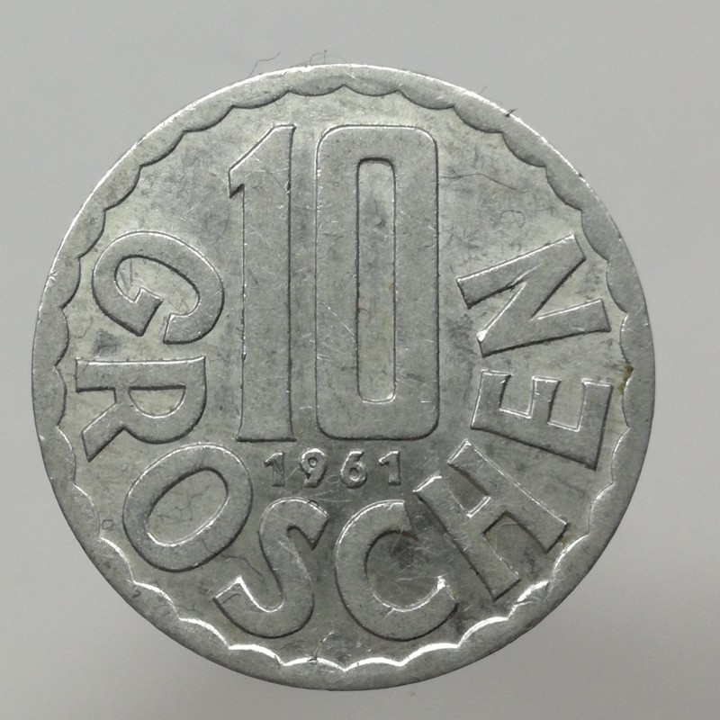 Obehová minca nominálnej hodnoty 10 groschen z roku 1961. Minca platila v obehu v Rakúsku.