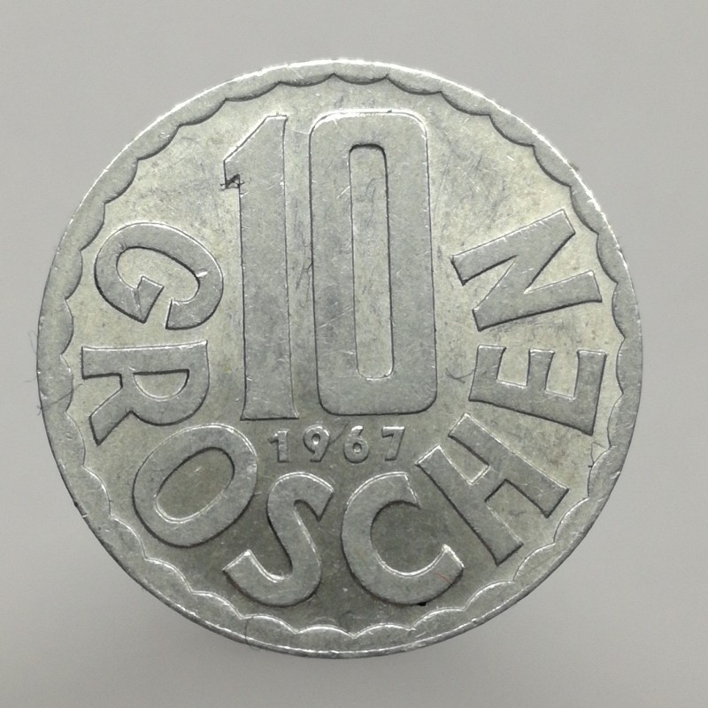 Obehová minca nominálnej hodnoty 10 groschen z roku 1967. Minca platila v obehu v Rakúsku.