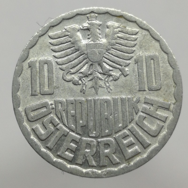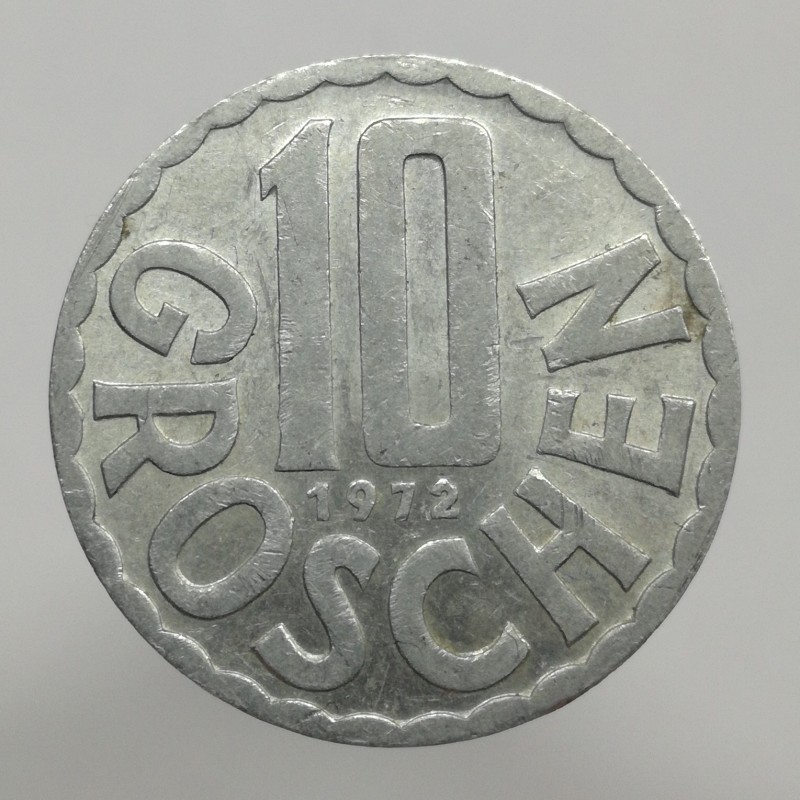 Obehová minca nominálnej hodnoty 10 groschen z roku 1972. Minca platila v obehu v Rakúsku.