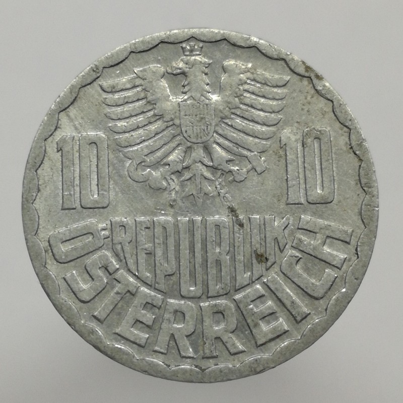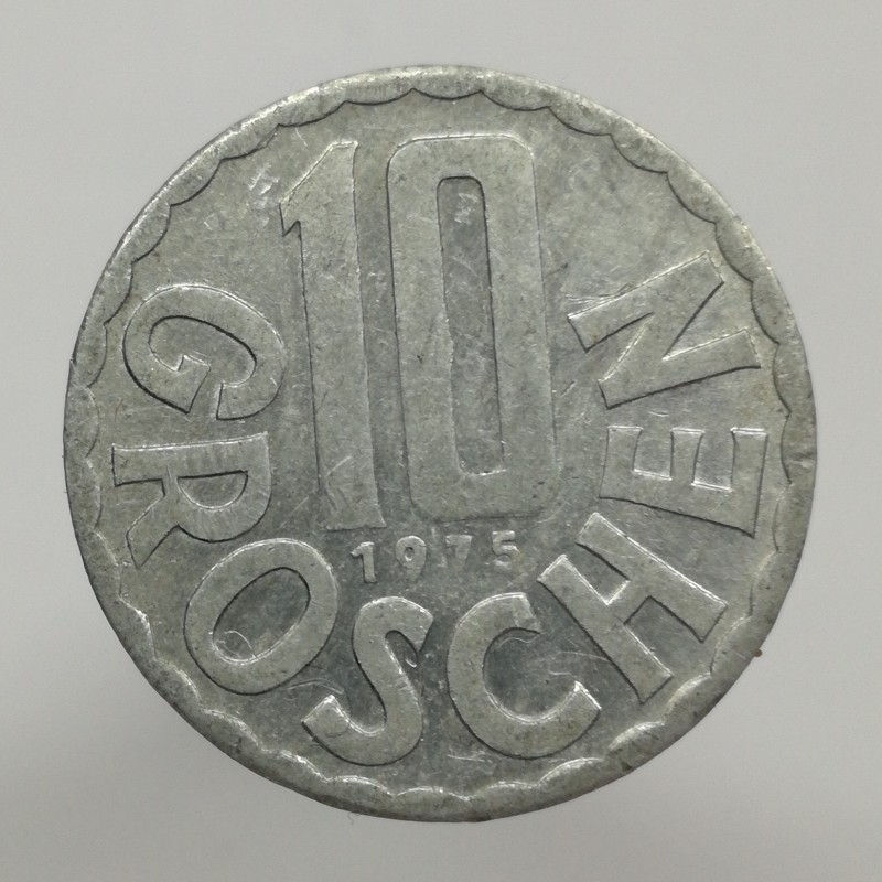 Obehová minca nominálnej hodnoty 10 groschen z roku 1975. Minca platila v obehu v Rakúsku.