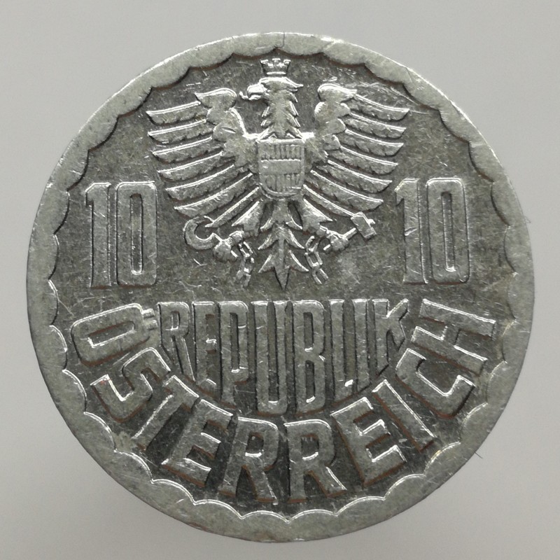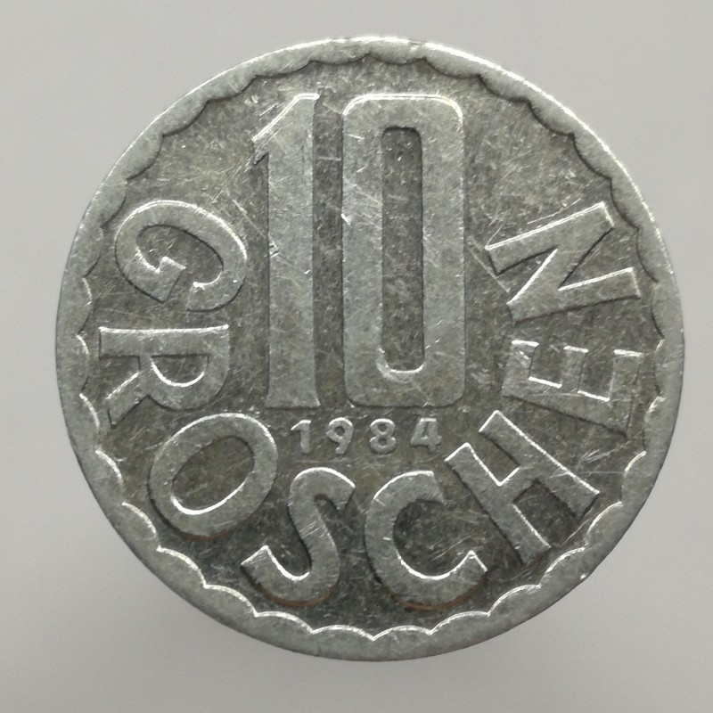 Obehová minca nominálnej hodnoty 10 groschen z roku 1984. Minca platila v obehu v Rakúsku.
