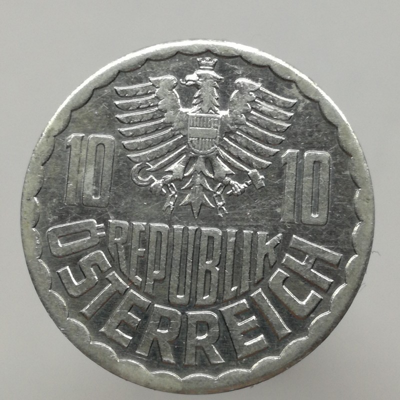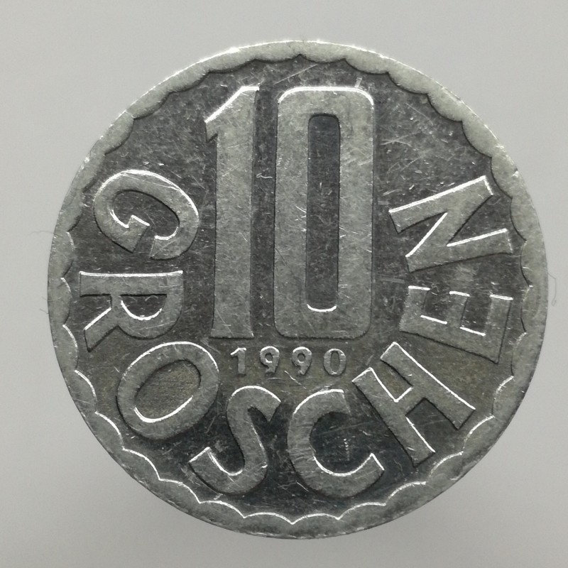 Obehová minca nominálnej hodnoty 10 groschen z roku 1990. Minca platila v obehu v Rakúsku.