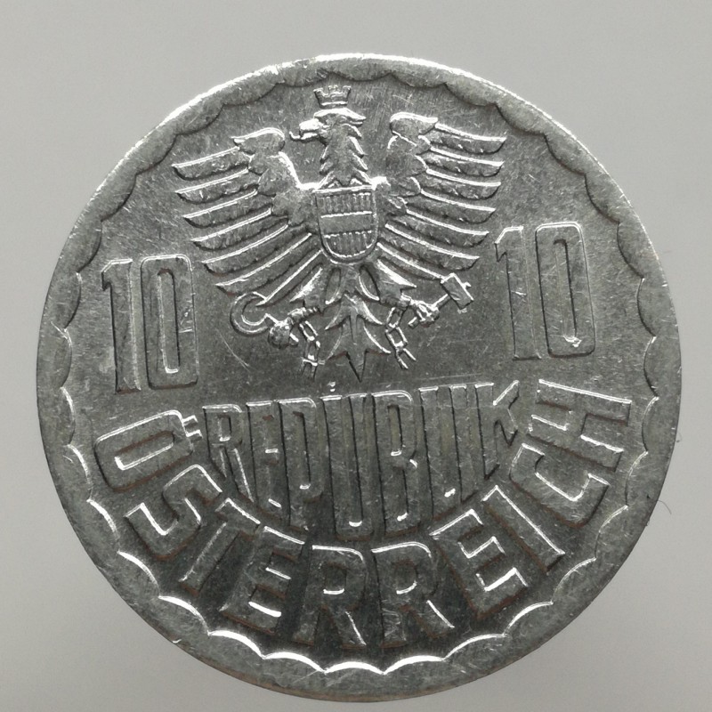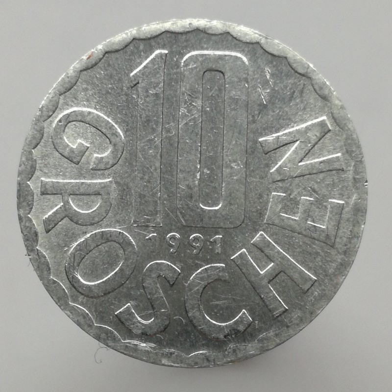 Obehová minca nominálnej hodnoty 10 groschen z roku 1991. Minca platila v obehu v Rakúsku.