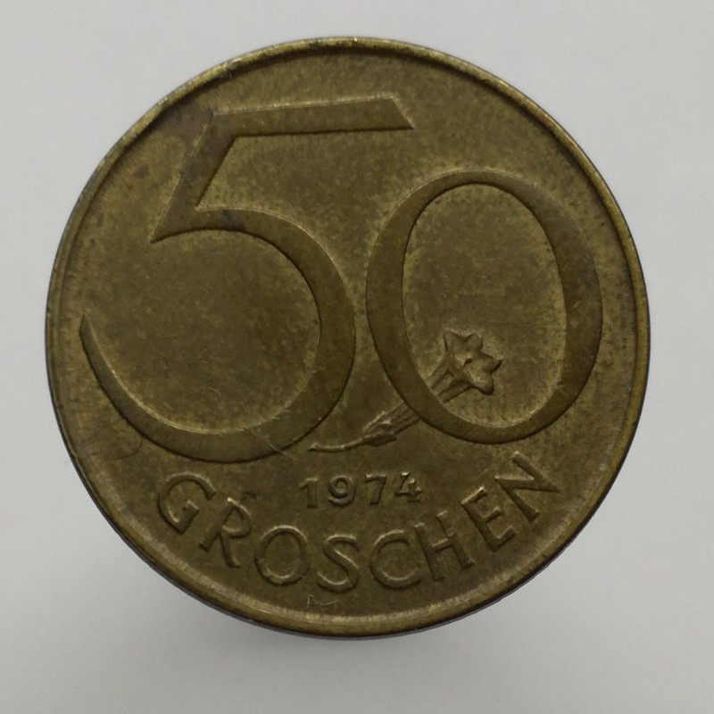 Obehová minca nominálnej hodnoty 50 groschen z roku 1974. Minca platila v obehu v Rakúsku.