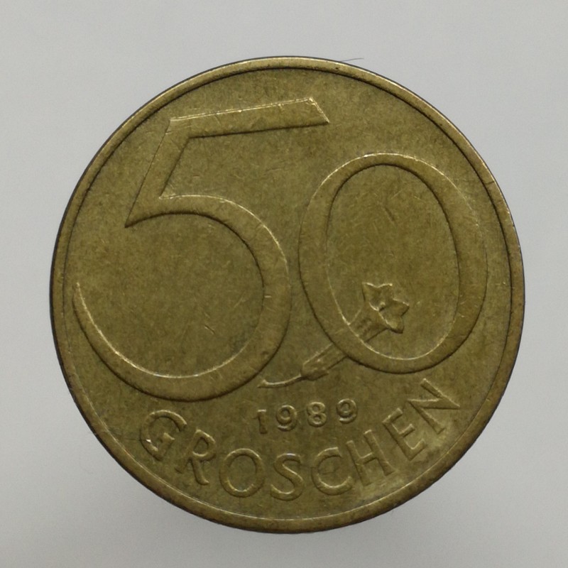 Obehová minca nominálnej hodnoty 50 groschen z roku 1989. Minca platila v obehu v Rakúsku.