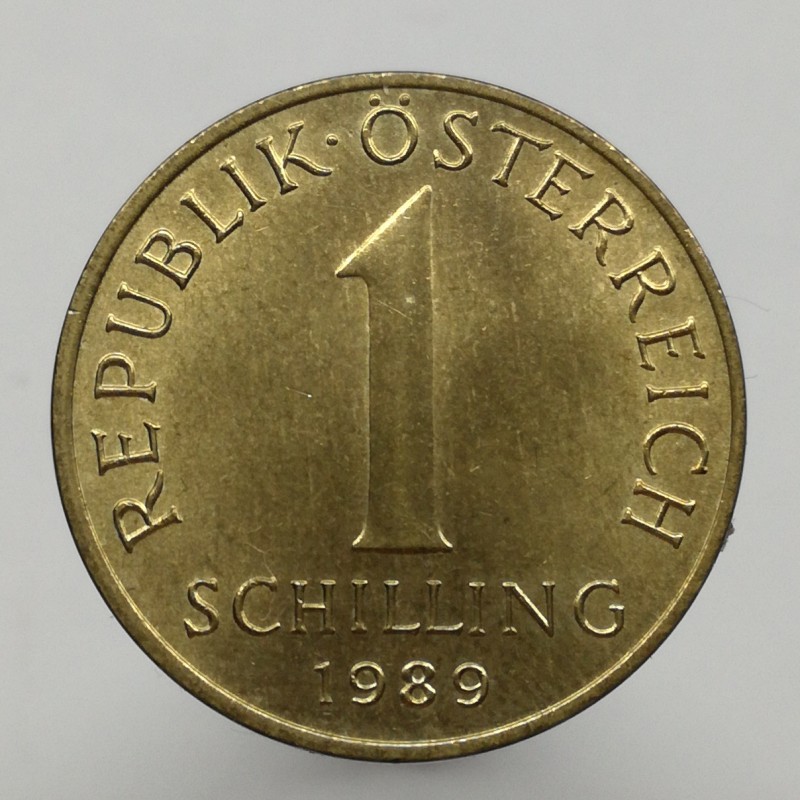 Obehová minca nominálnej hodnoty 1 schilling z roku 1989.