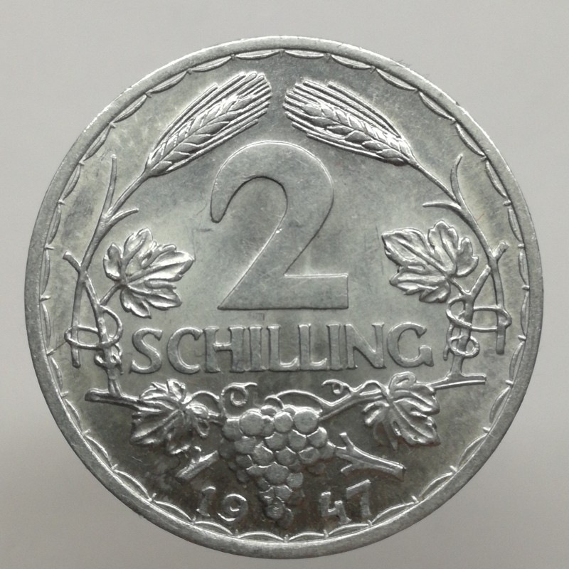 Obehová minca nominálnej hodnoty 2 schilling z roku 1947. Minca platila v obehu v Rakúsku.