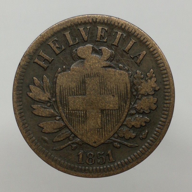 Obehová minca nominálnej hodnoty 2 rappen z roku 1851. Minca platila na území Švajčiarska.