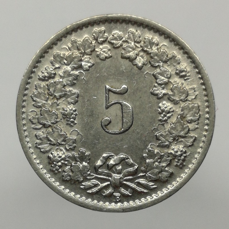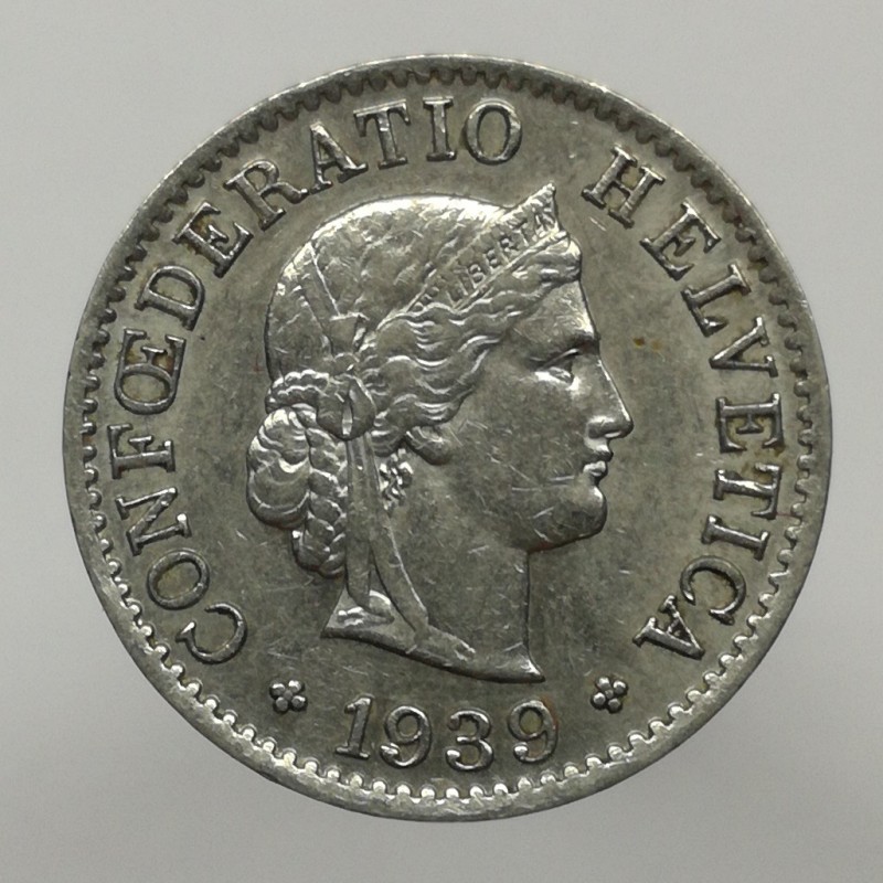 Obehová minca nominálnej hodnoty 5 rappen z roku 1939. Minca platila na území Švajčiarska.