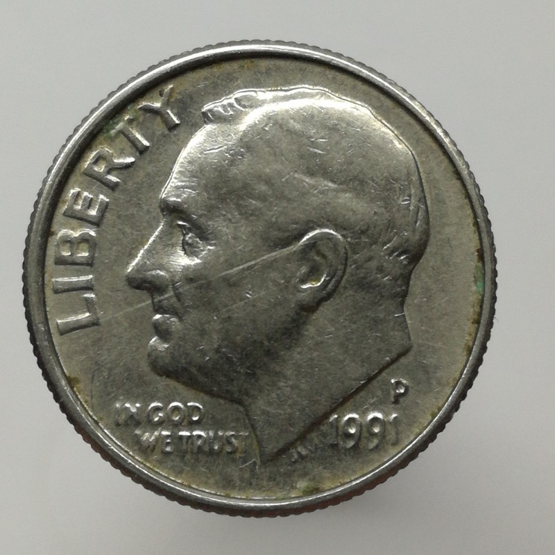 Obehová minca nominálnej hodnoty 1 dime z roku 1991. Minca platila v obehu v Spojených štátoch amerických.