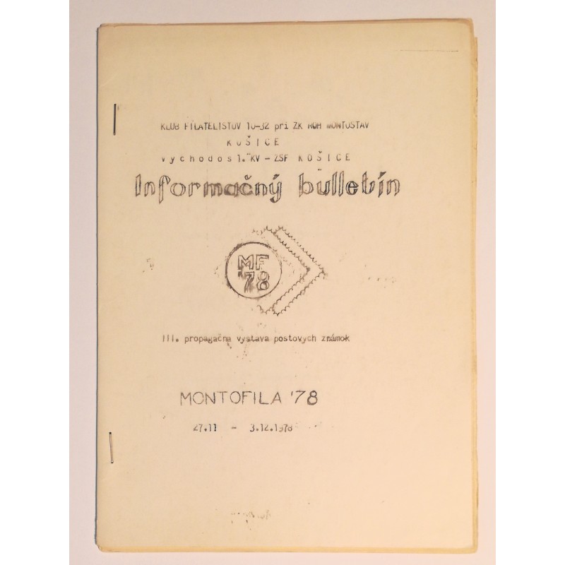 Informačný bulletín k tretej propagačnej výstave poštových známok. Výstava sa konala v roku 1978 pod názvom MONTOFILA 78 v meste Košice.